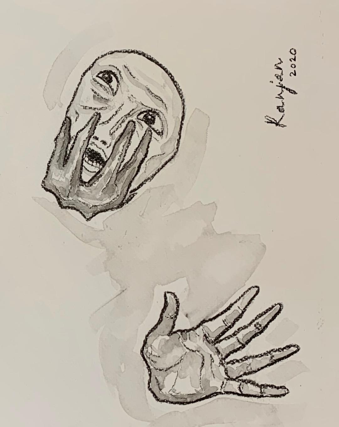 The masked appearance is simultaneously the tell-tale mark of the policed citizen. What lies behind the ubiquitous masking in the city’s underbelly is etched in the accompanying graphic representations. Ranjan Kaul, a Delhi-based artist, portrays the context of slum-dwellers in the city through a panel of charcoal drawings. His first frame focuses on a woman who perceives her hand as unnatural, oversized, and oppressive as it foists a mask that leaves her gagged and bound. The emaciated, masked man in the next frame is immobilized by the state-mandated curfew. The watchful eye and the whip in the corner, ready to be cracked, sums up the ocular display of power outside. The third drawing recreates a condensed image of the slum. People are huddled in a single-room tenement with an ominous crow above. A man is walking back from the slum’s common toilet and a woman is bringing water home (since the area does not have a piped supply). These activities cannot be disallowed, but the image of the policeman brandishing his cane is omnipresent.